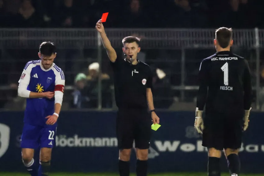 Die Ostfriesen waren um den Ausgleich bemüht - und mussten in der 82. Minute den nächsten Rückschlag verkraften. Nach einem Zweikampf mit Moritz Dittmann ging Dennis Engel im Strafraum zu Boden. Der Kickers-Kapitän stand direkt wieder auf und reklamierte nicht, aber Schiedsrichter Maximilian Nie-Hoegen (Lingen (Ems)) hatte seine Entscheidung bereits getroffen: Er zeigte Engel für eine Schwalbe die Gelb-Rote Karte.